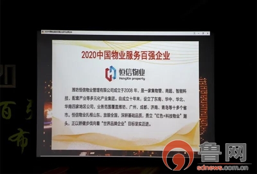 鲁网5月14日讯 5月13日,由中国指数研究院、中国房地产top10研究组联合主办的"2020中国物业服务百强企业研究成果发布会暨第十三届中国物业服务百强企业家峰会"在全国658个城市同步直播举行。潍坊恒信物业管理有限公司作为山东省领军物业企业受邀参会,并荣膺"2020中国物业服务百强企业"第65位,斩获top100殊荣。