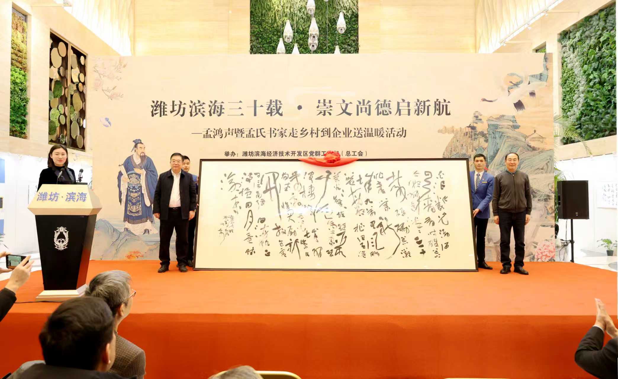 在作品展示环节,孟鸿声先生专门为滨海区创作的《滨海赋》,以雄浑笔墨勾勒出这片土地从昔日盐碱荒滩到今日现代化新城的沧桑巨变,生动描绘了港产城融合发展、向海图强奋进的壮阔篇章,为建区三十年献上一份厚重的文化贺礼。活动同步启动孟鸿声暨孟氏书家走乡村到企业送温暖活动,先后到央子街道崔家央子村、天一化学股份有限公司等村居企业,把带着温度的手书“福”字与春联,送到了基层群众与企业一线,进一步满足人民群众对更高层次、更富内涵美好文化生活的向往,以实际行动生动践行“文艺属于人民、文艺为了人民”的根本宗旨。此次活动开展,进一步凝聚了滨海干部群众的思想共识,增强了发展认同,为滨海高质量发展注入了强大的精神文化力量。(通讯员 纪哲)
