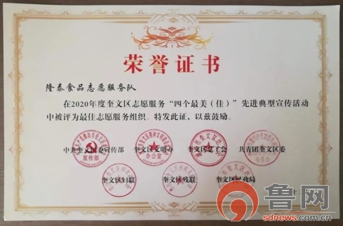 近日,在2020年度潍坊市奎文区志愿服务“四个最美(佳)”先进典型宣传活动中,隆泰食品志愿服务队被评为“最佳志愿服务组织”称号。