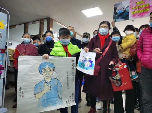 在欢迎的人群中,一名小男孩手里拿着两幅美术作品,一幅画的是该院执行院长魏春华,另一幅是5名援鄂医护人员。