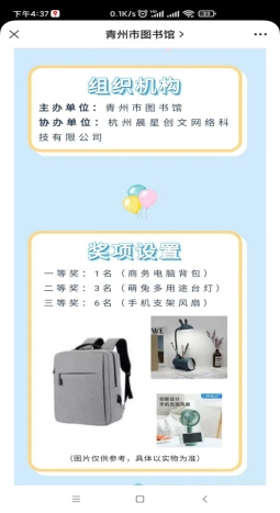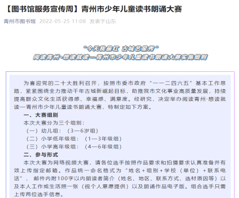 4、阅读青州·想读就读—青州市少年儿童读书朗诵大赛火热进行。为喜迎党的二十大胜利召开,按照市委市政府“一一二四六五”基本工作思路,紧紧围绕全力推动千年古城新崛起目标,助推青州市文化事业高质量发展,持续提高群众文化生活获得感、幸福感、满意度。经研究,决定举办阅读青州·想读就读—青州市少年儿童读书朗诵大赛,目前已收集作品百余个,活动影响力大。