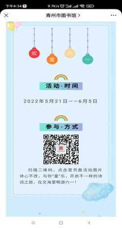 6、“诗心不改,与你‘童’乐”——“六一”儿童节网络诗词大赛。“六一”儿童节,是个值得欢庆的日子,也是小朋友们自己的节日。为了使小朋友们能过一个有意义而快乐的六一节,让其在参与活动的过程中,体会古诗文的深刻内涵,传承中华文化、发扬中华文明、提高文化底蕴。青州市图书馆特举办 “诗心不改,与你‘童’乐”网络诗词大赛活动。