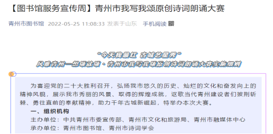 5、风雅青州·想颂就颂—青州市我写我颂原创诗词朗诵大赛。为喜迎党的二十大胜利召开,弘扬青州市悠久的历史、灿烂的文化和奋发向上的精神风貌,展示青州市秀丽的风景、取得的辉煌成就,讴歌当代青州建设者们披荆斩棘、勇往直前的奉献精神,助力千年古城新崛起,特举办风雅青州·想颂就颂—青州市我写我颂原创诗词朗诵大赛。目前作品仍在持续征集中,原创诗词征集活动深刻展现了潍坊厚重的历史文化。