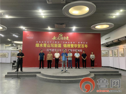 7月16日上午,山东潍坊寿光市举行党史学习教育“书画挂起来”系列活动之“绿水青山写新篇 锦绣繁华贺百年”——庆祝建党百年王进、尹虹中国画展开展仪式。
